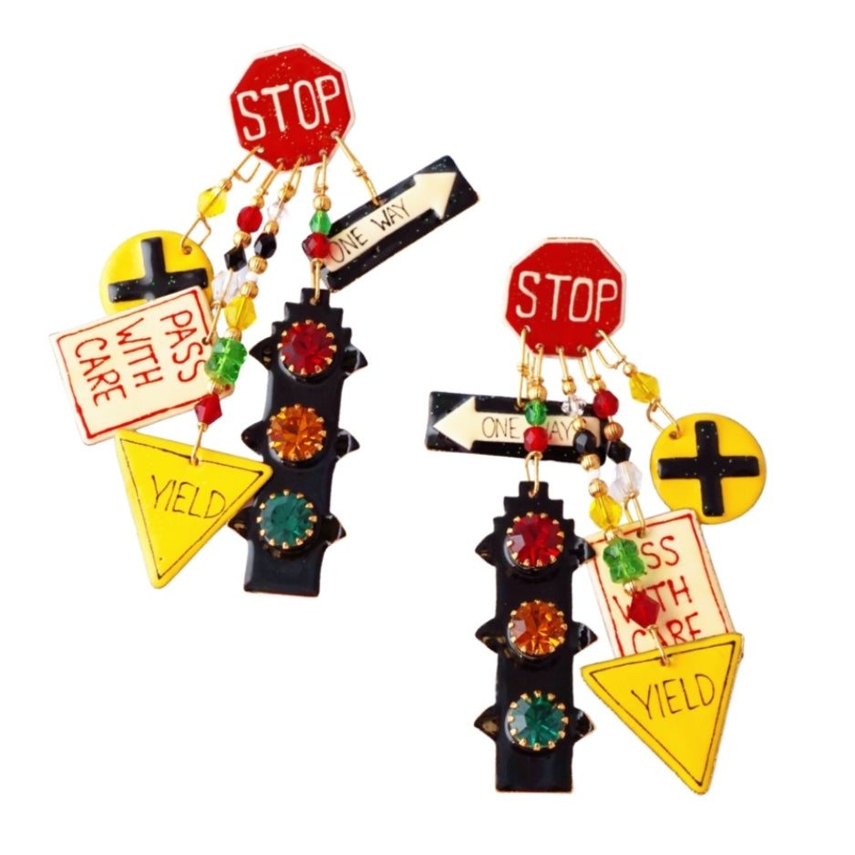 Traffic Signs "Signals" Enameled Statement Dangle Earrings By Lunch at the Ritz, 1980s
