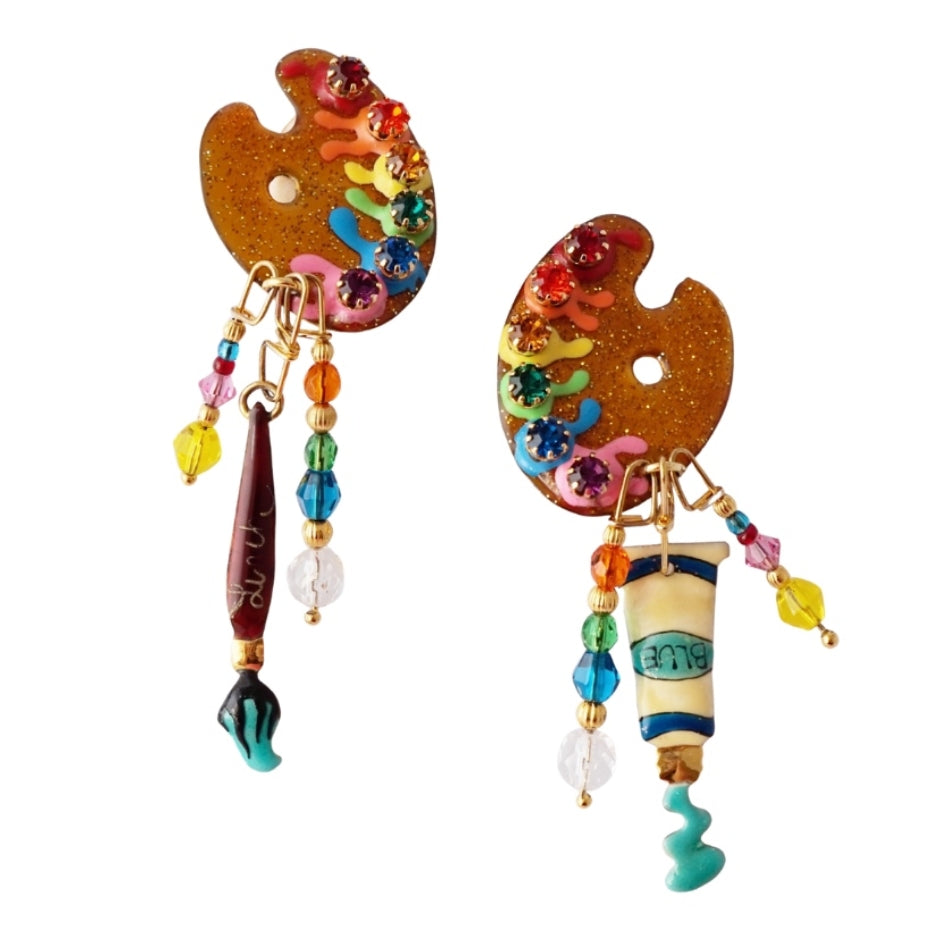 Rainbow Artist Palette Enameled Statement Dangle Earrings By Lunch at the Ritz, 1980s