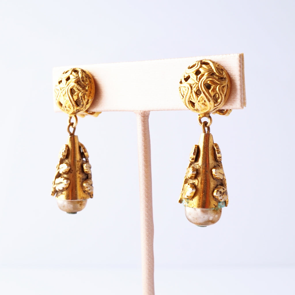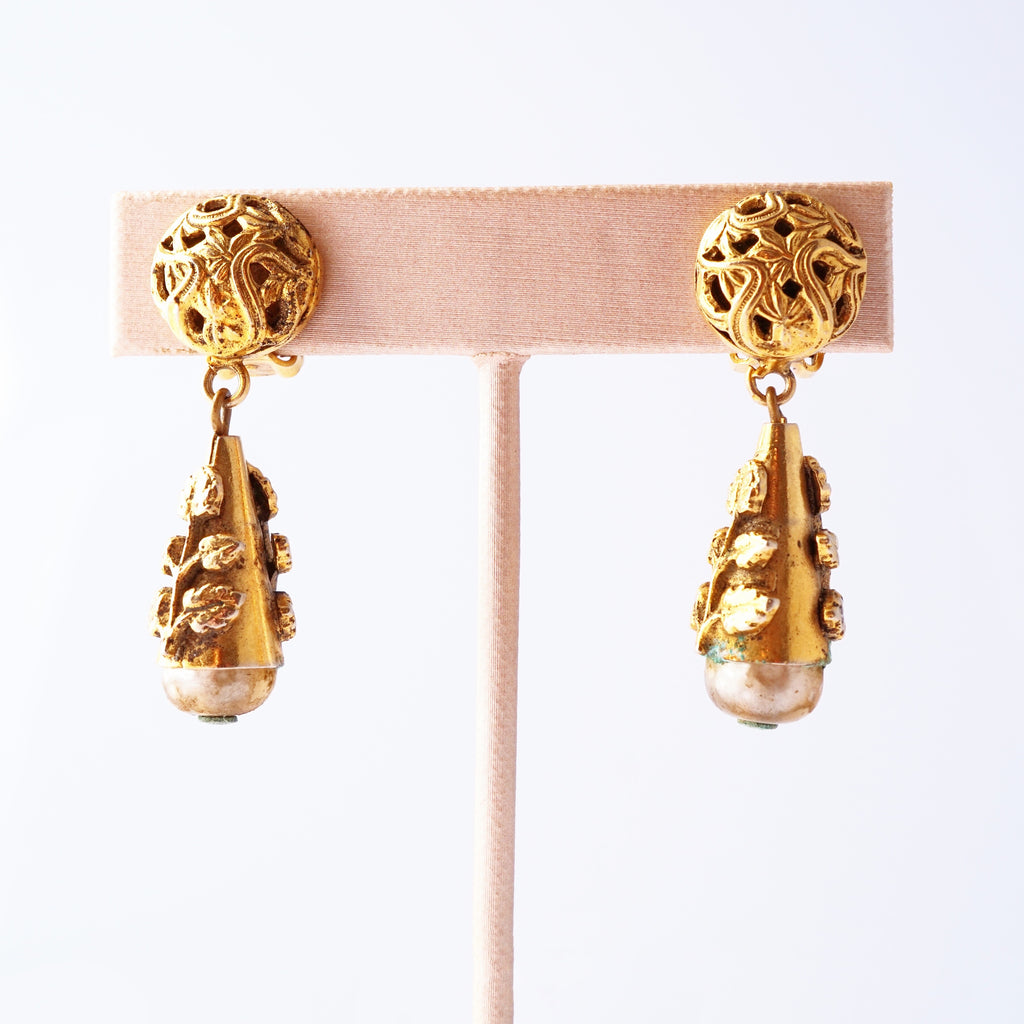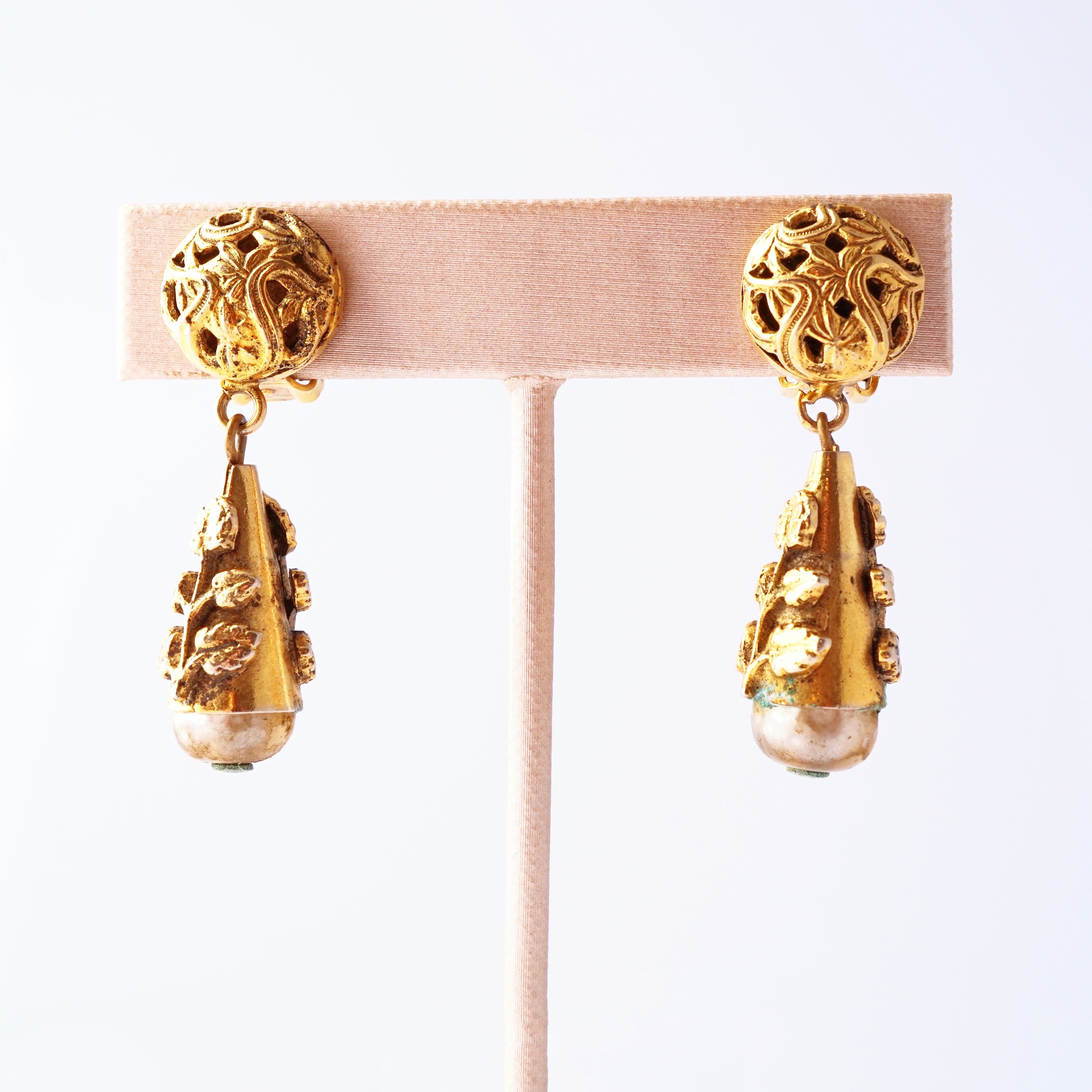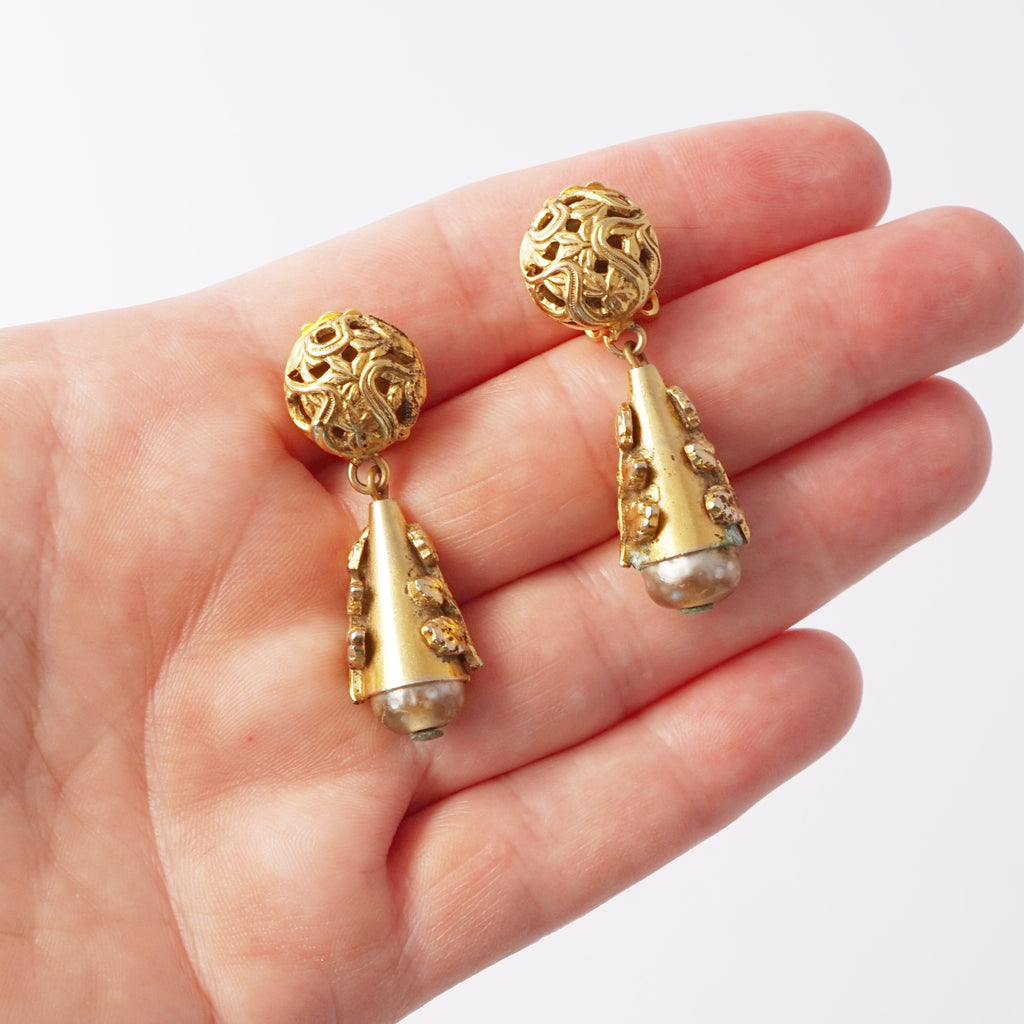 Romantic and refined, these 1950s Freirích earrings are a masterclass in vintage artistry. Each features an ornate openwork filigree top leading to an elongated cone drop adorned with raised floral motifs and finished with luminous faux baroque pearls. The richly gilded finish exudes old-world glamour, while the sculptural detailing captures the opulent charm of mid-century European couture jewelry. Perfect for adding a touch of gilded romance to any look — graceful, regal, and unapologetically vintage.