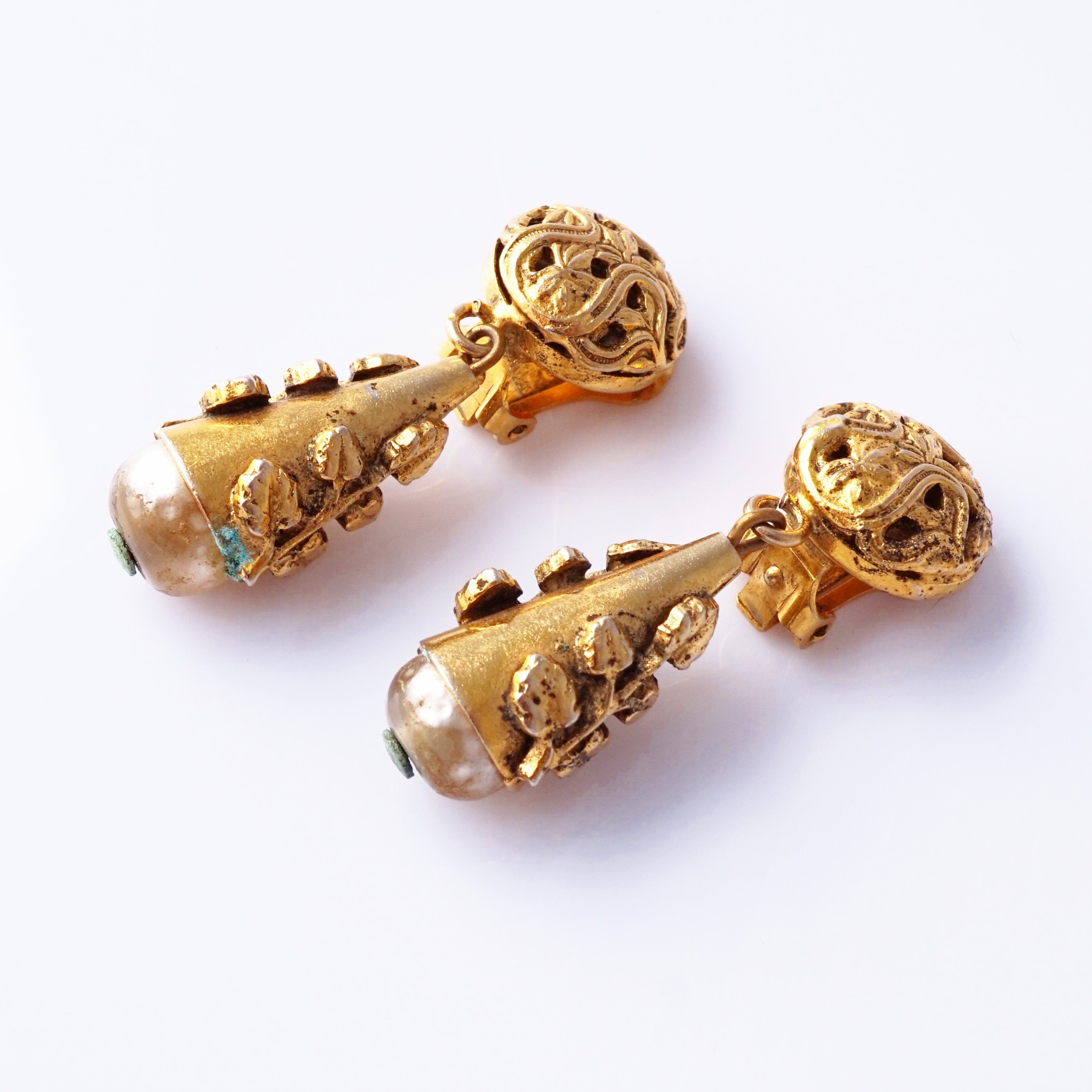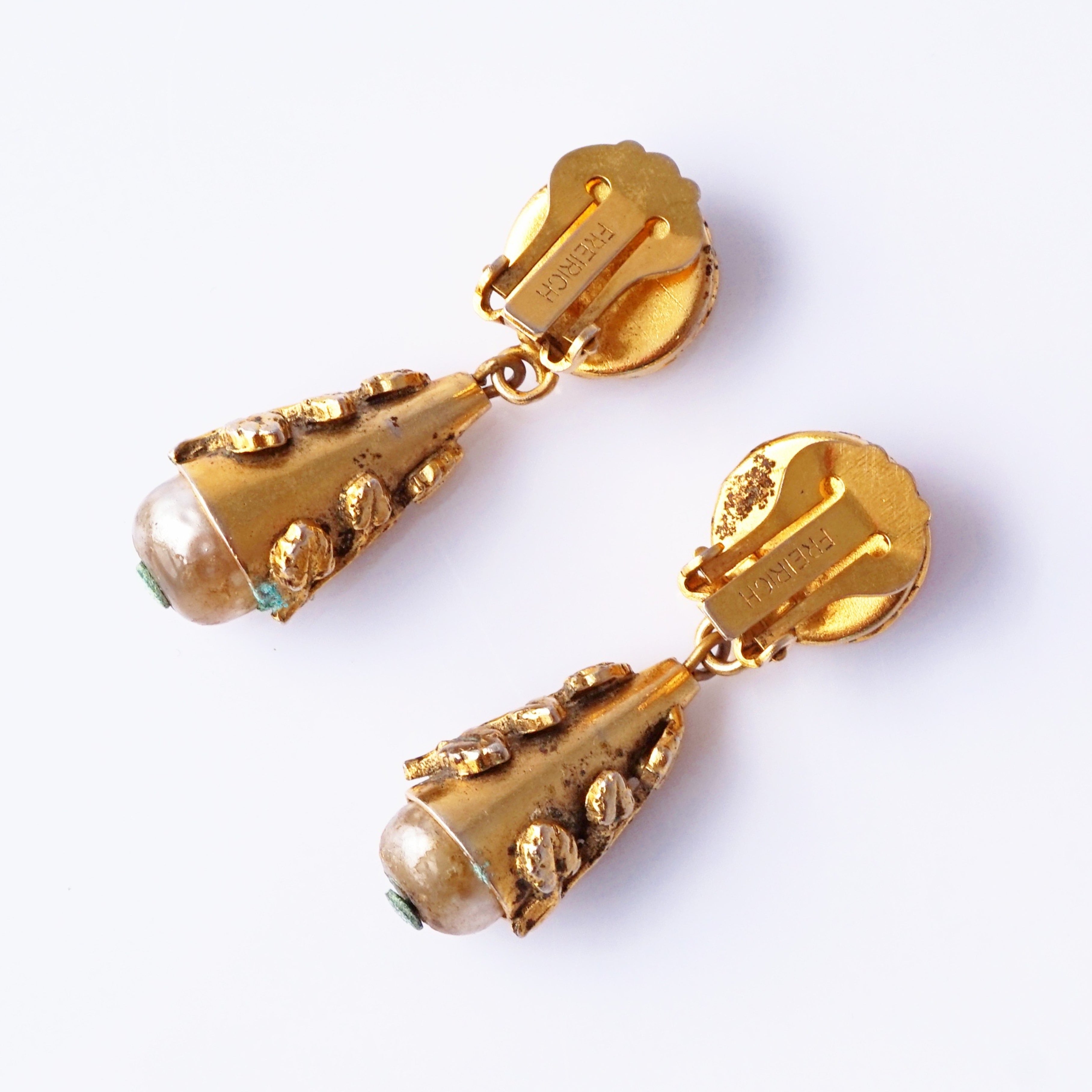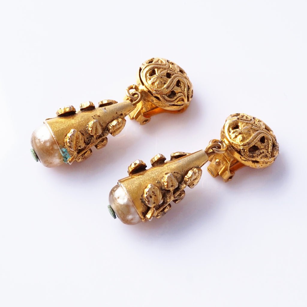 Romantic and refined, these 1950s Freirích earrings are a masterclass in vintage artistry. Each features an ornate openwork filigree top leading to an elongated cone drop adorned with raised floral motifs and finished with luminous faux baroque pearls. The richly gilded finish exudes old-world glamour, while the sculptural detailing captures the opulent charm of mid-century European couture jewelry. Perfect for adding a touch of gilded romance to any look — graceful, regal, and unapologetically vintage.