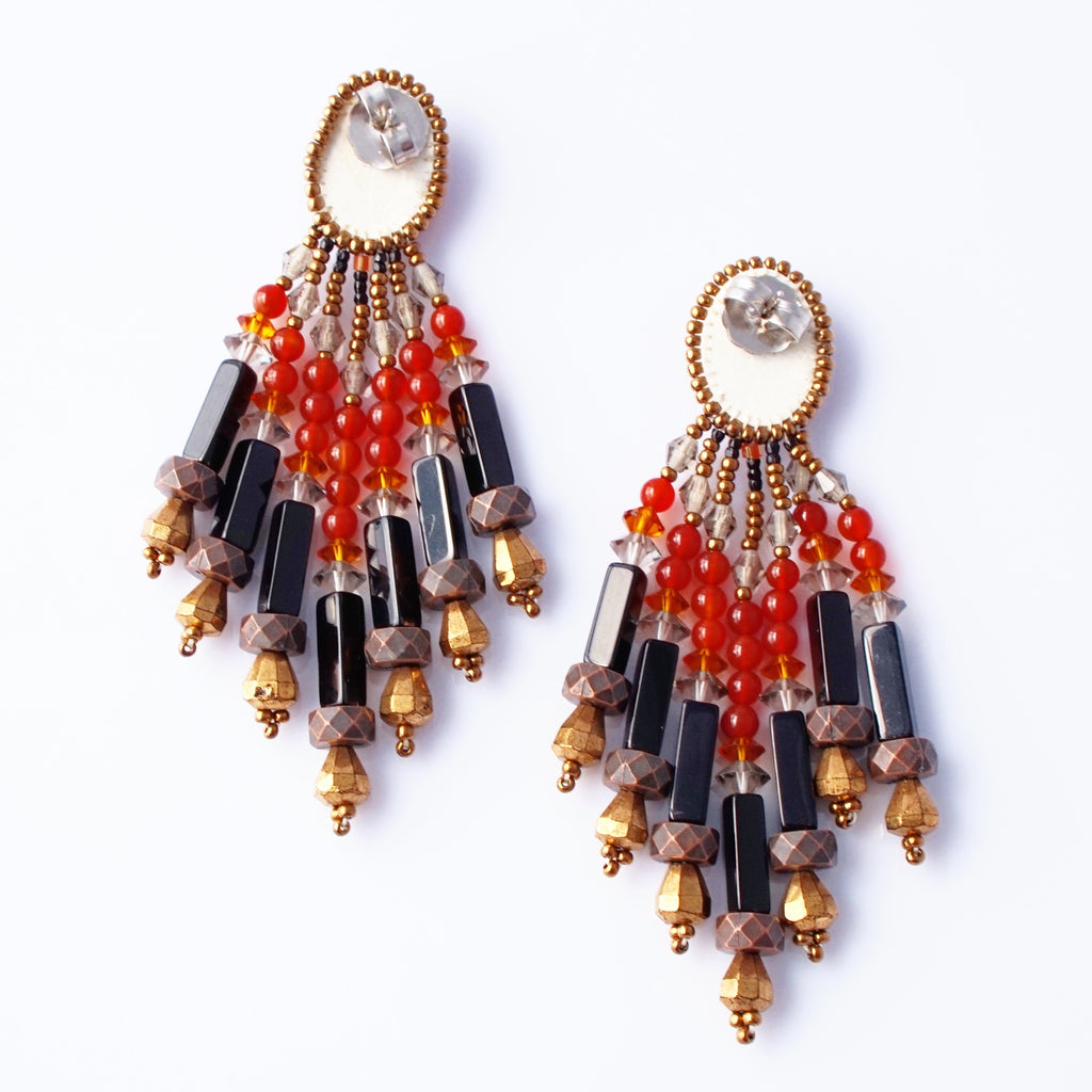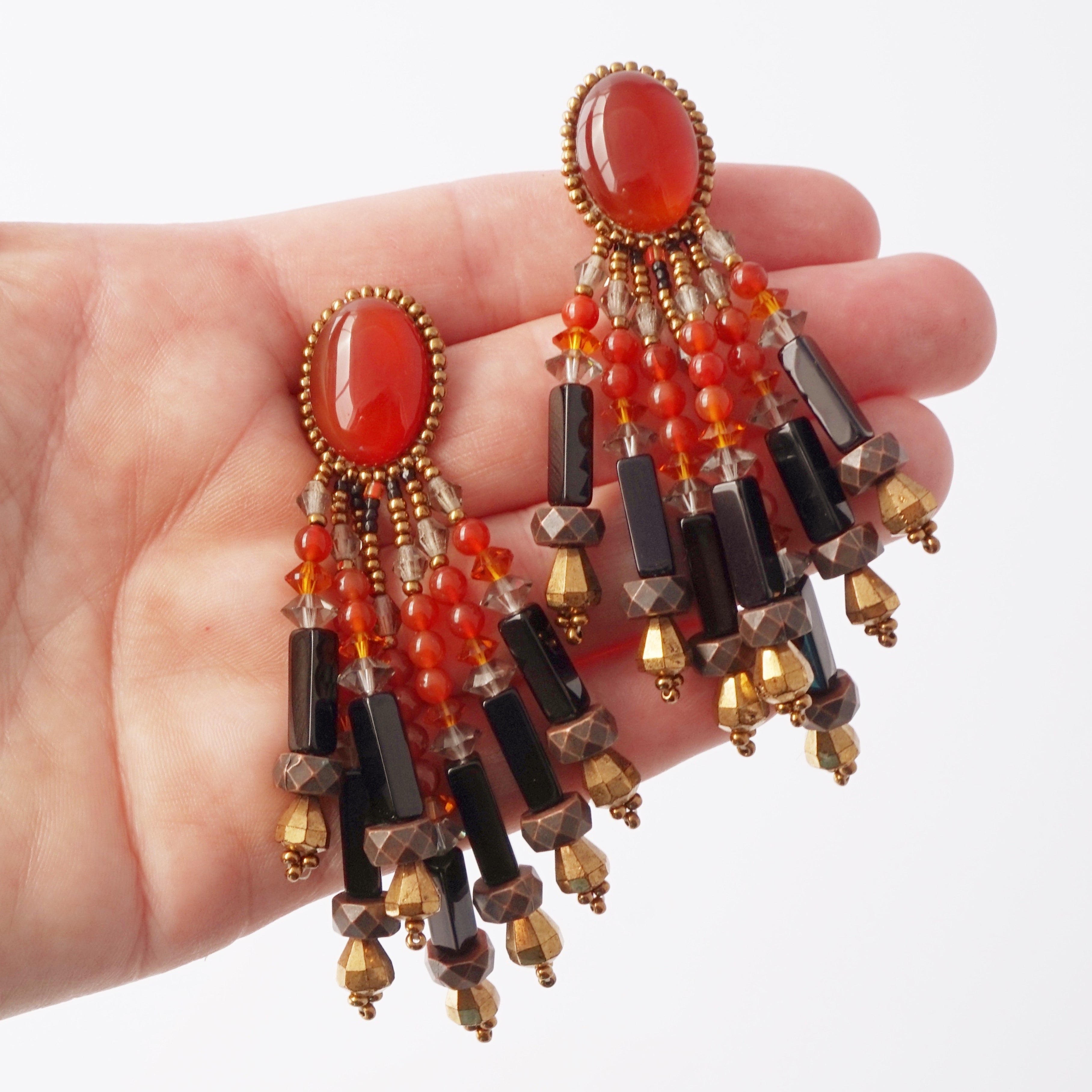 Orange and Black Beaded Dangle Earrings By Chipita, 1980s