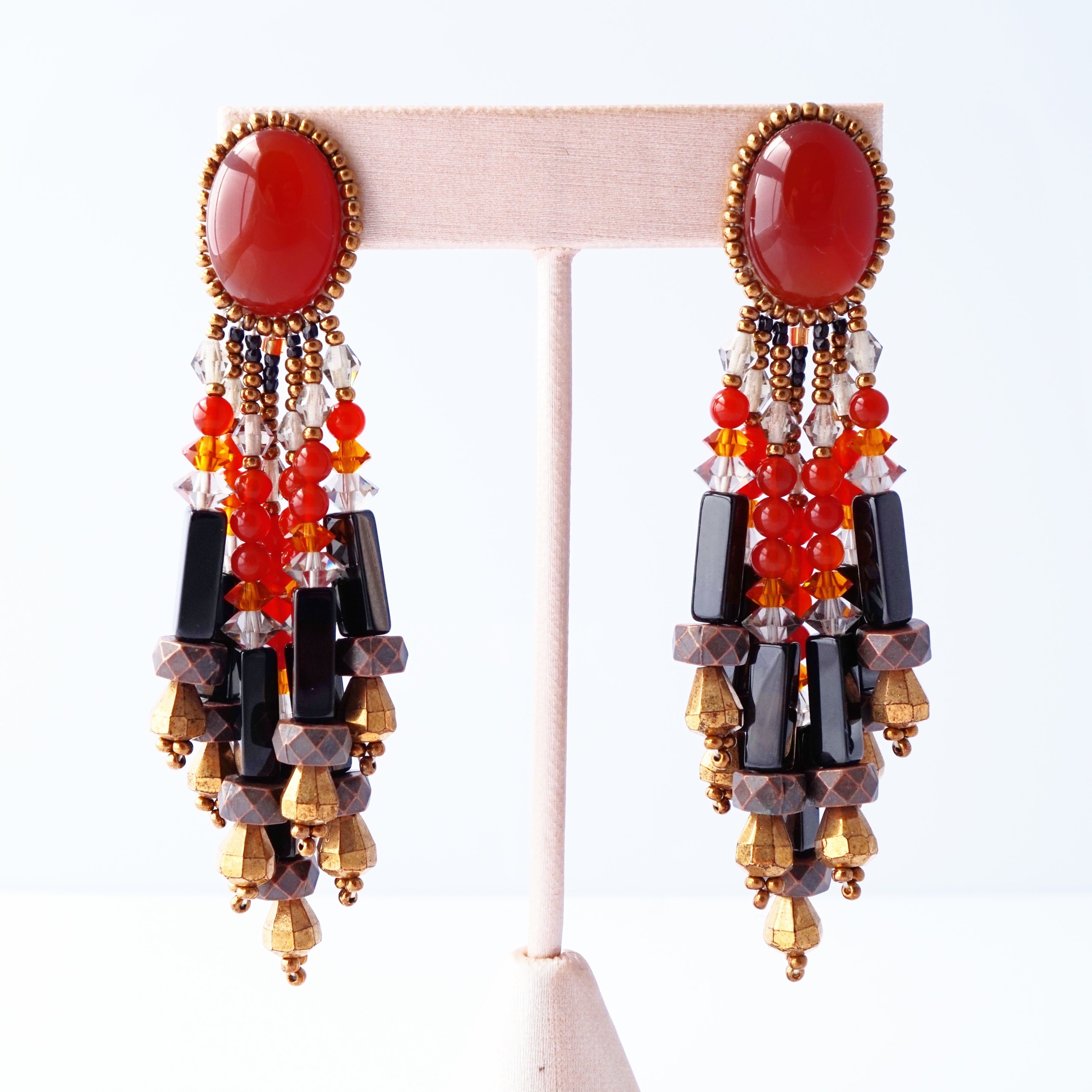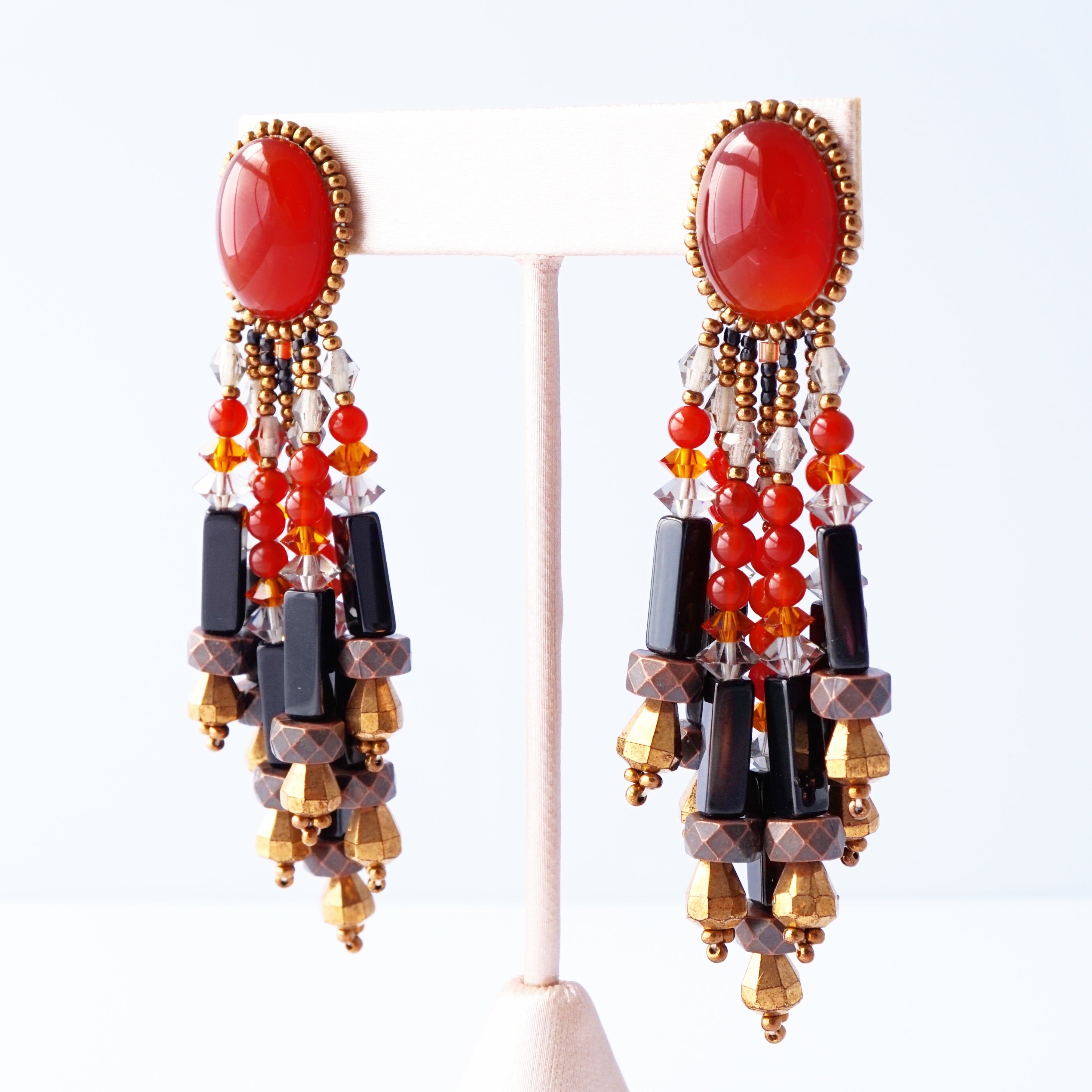 Make a dramatic entrance with these stunning 1980s Chipita dangle earrings — an explosion of color, texture, and movement straight out of the art-to-wear era. Featuring rich red faux carnelian cabochon tops framed in golden seed beads, cascading strands of faceted glass, black tubular beads, and gilded accents, they capture that bold, high-glam bohemian spirit Chipita is known for. Lightweight yet full of presence, these are museum-chic meets downtown diva — the perfect pair for collectors and maximalist style lovers alike.