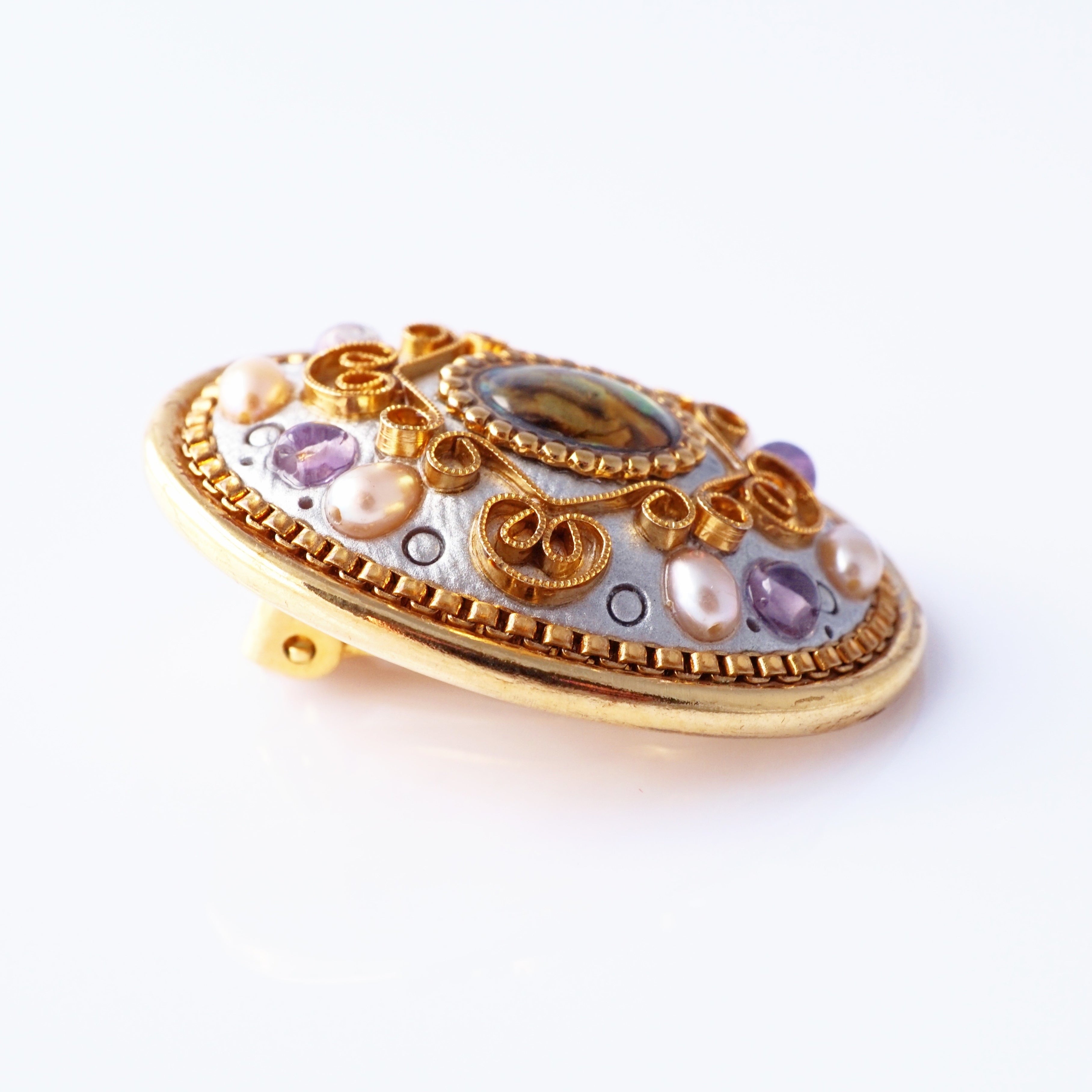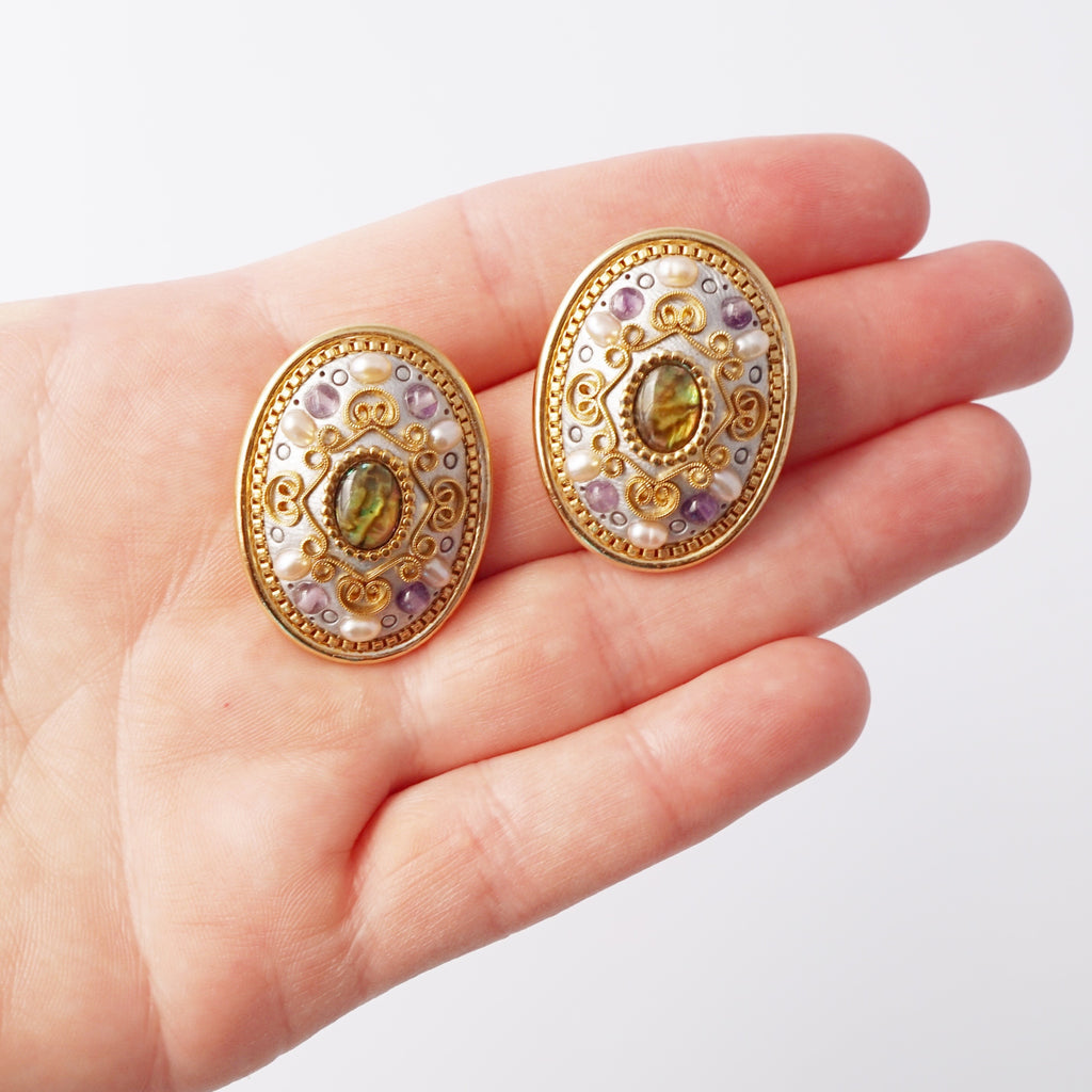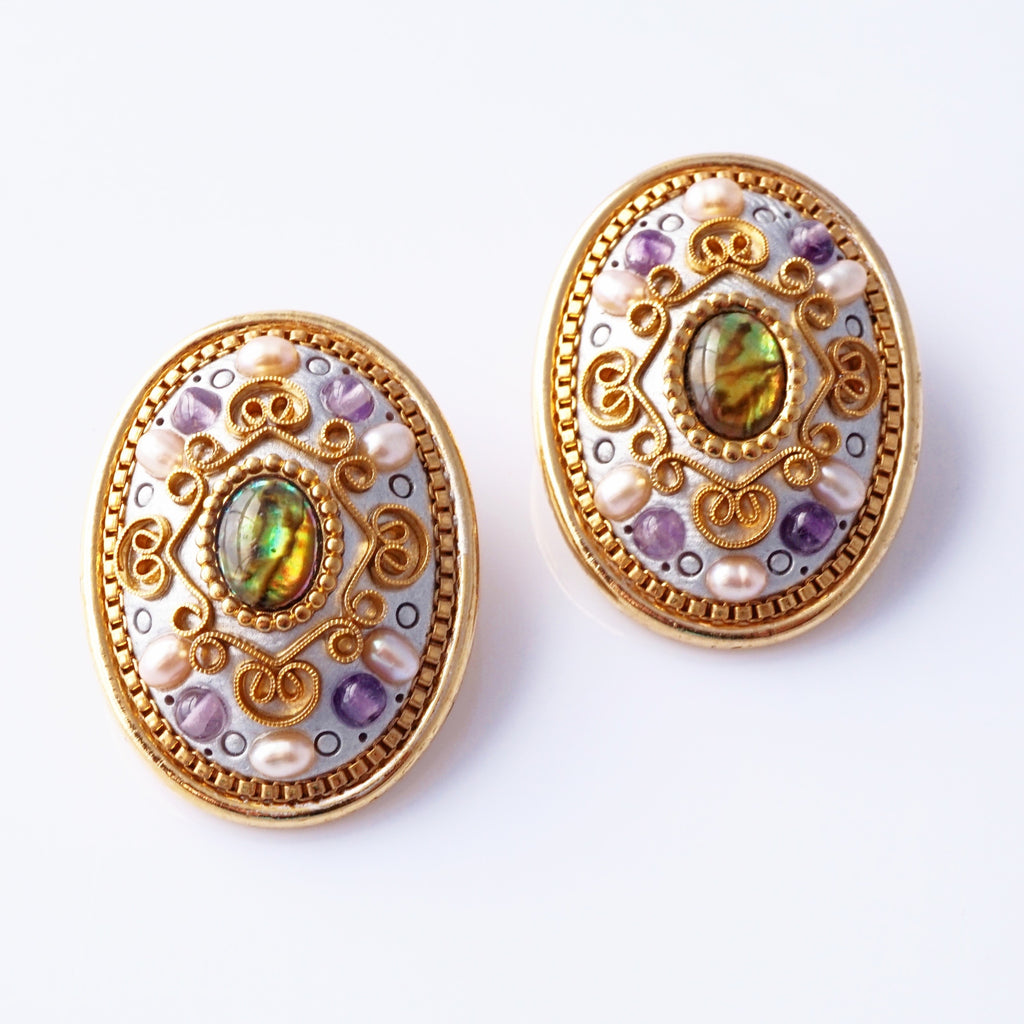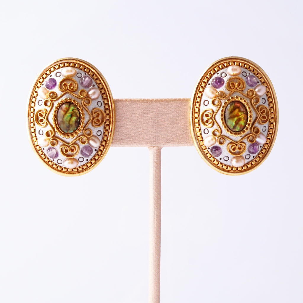 Step into the artful opulence of the 1990s with these breathtaking Michal Golan earrings — a handcrafted fusion of mysticism and maximalism. Each gold-tone oval is adorned with filigree scrollwork, luminous freshwater pearls, and royal purple amethysts encircling a mesmerizing abalone cabochon that glows with oceanic iridescence. Regal yet bohemian, these earrings are wearable works of art — perfect for collectors and dreamers who love a touch of celestial glam.