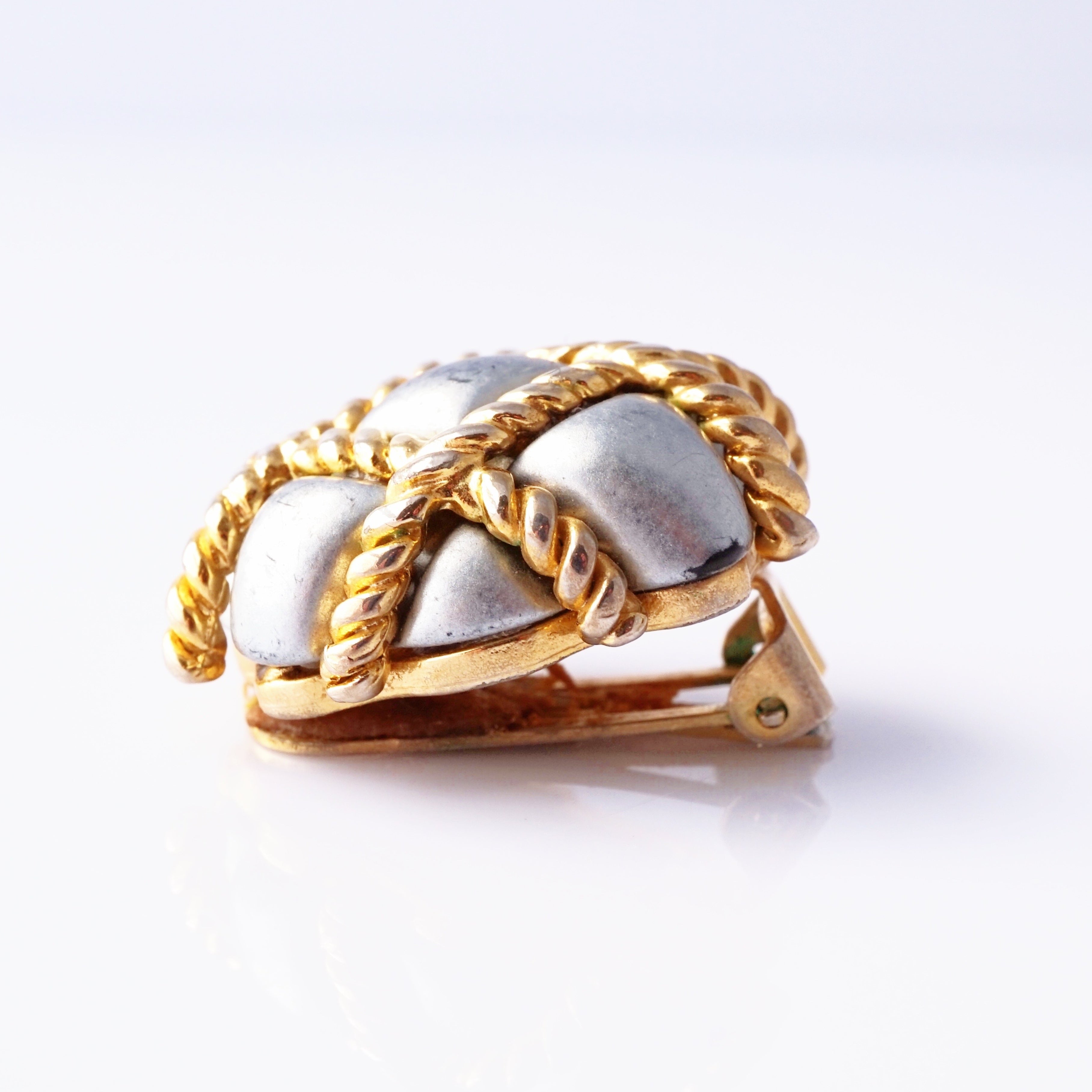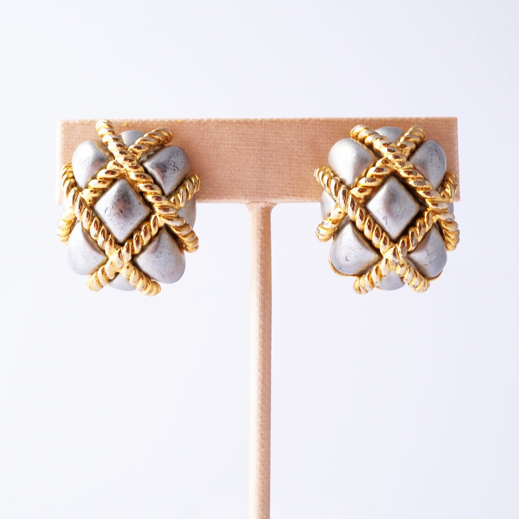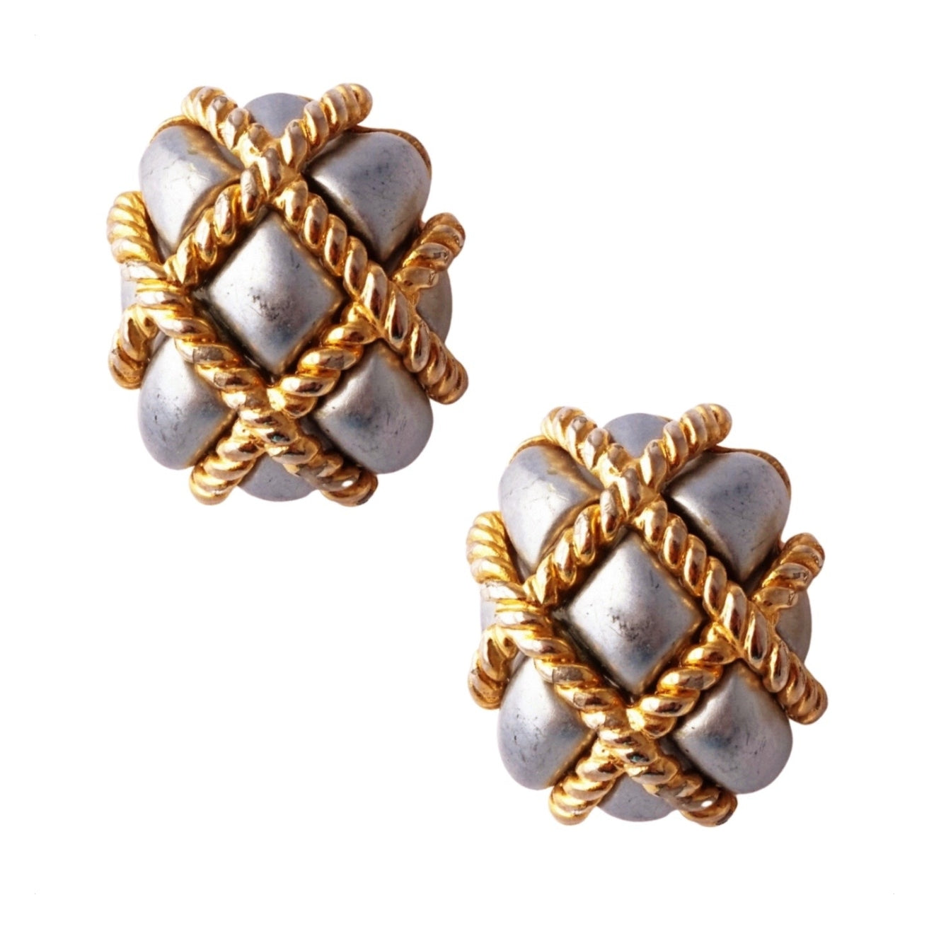 Iconic and effortlessly chic, these 1980s Kenneth Jay Lane earrings are the epitome of statement sophistication. Featuring quilted silver resin wrapped in crisscrossing gold rope detailing, they blend luxe texture with timeless design. The bold mixed-metal finish makes them endlessly versatile — equally at home with a power suit, a little black dress, or your favorite vintage denim. True to KJL’s signature style, they radiate Park Avenue polish with a dash of drama.
