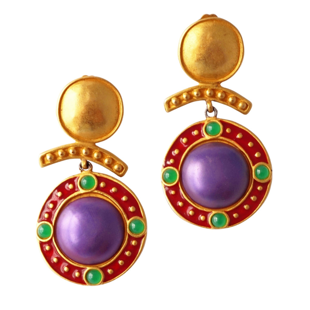 Ruby Enamel and Purple Cabochon Byzantine Statement Earrings By Leslie Block, 1980s