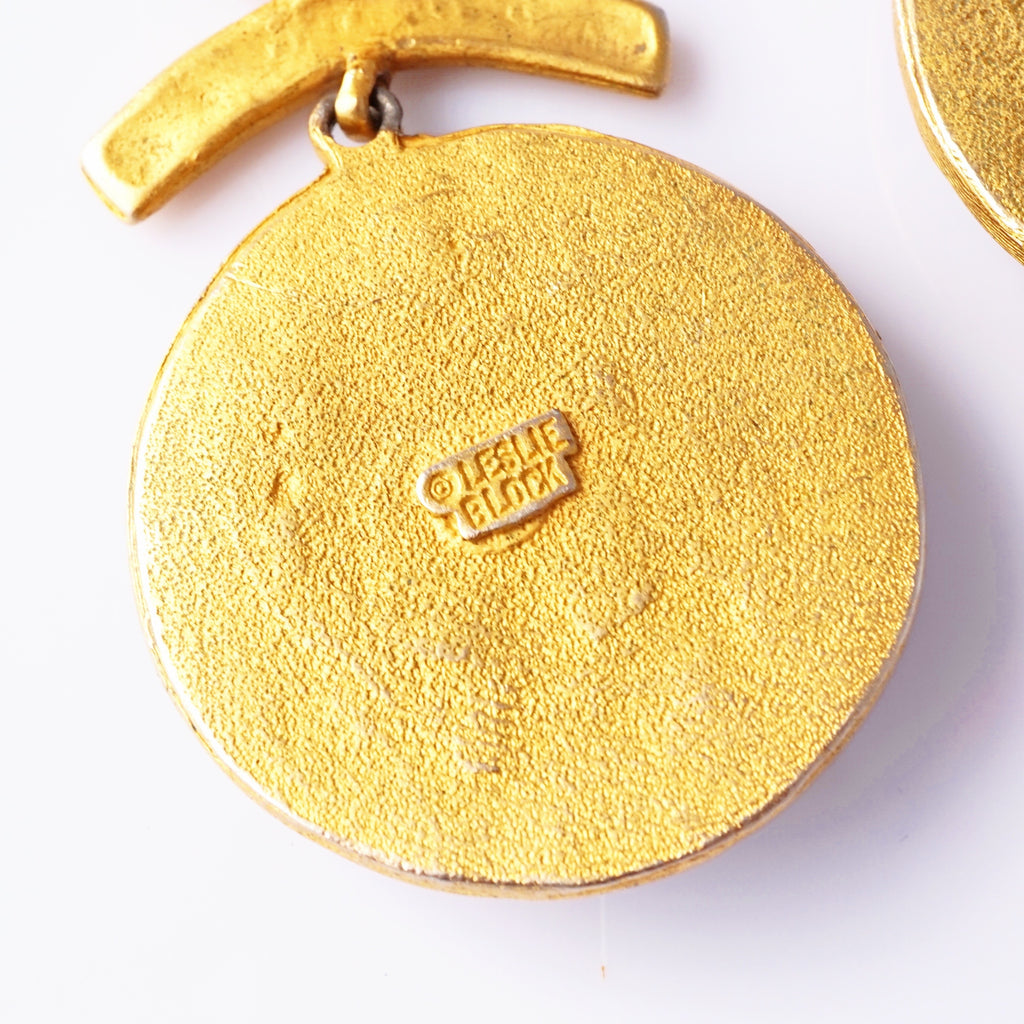 These dazzling 1980s Leslie Block earrings are pure power-era perfection — bold, sculptural, and utterly fabulous. Featuring a geometric gold design with enamel accents in regal red and emerald green, each piece centers a striking domed cabochon in royal purple. The color trio gives off luxe Byzantine vibes with a pop-art twist, making them an instant conversation piece. Glamorous yet playful, they’re ideal for collectors and anyone channeling their inner ’80s icon.