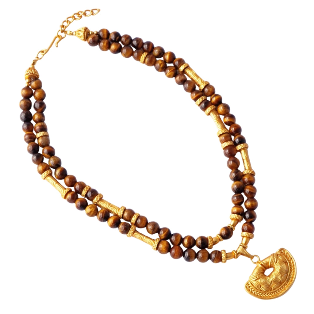 24k Gold Pre-Columbian Inca Tiger's Eye Beaded Necklace By Cano Jewelry, 1970s