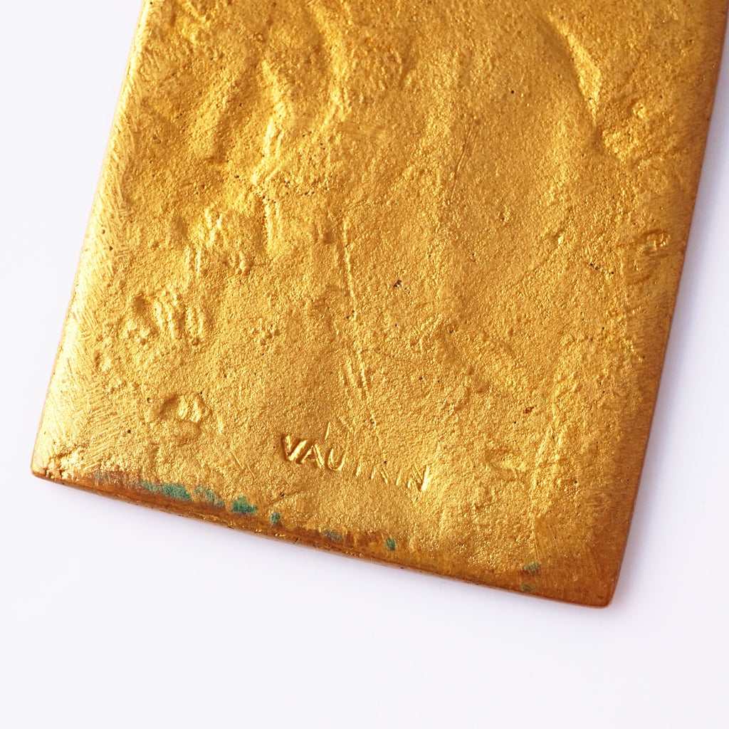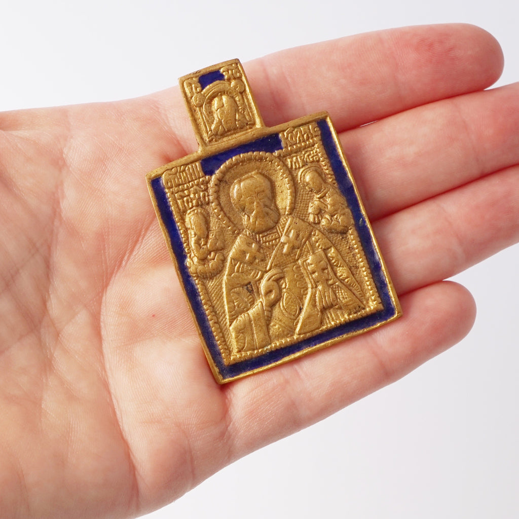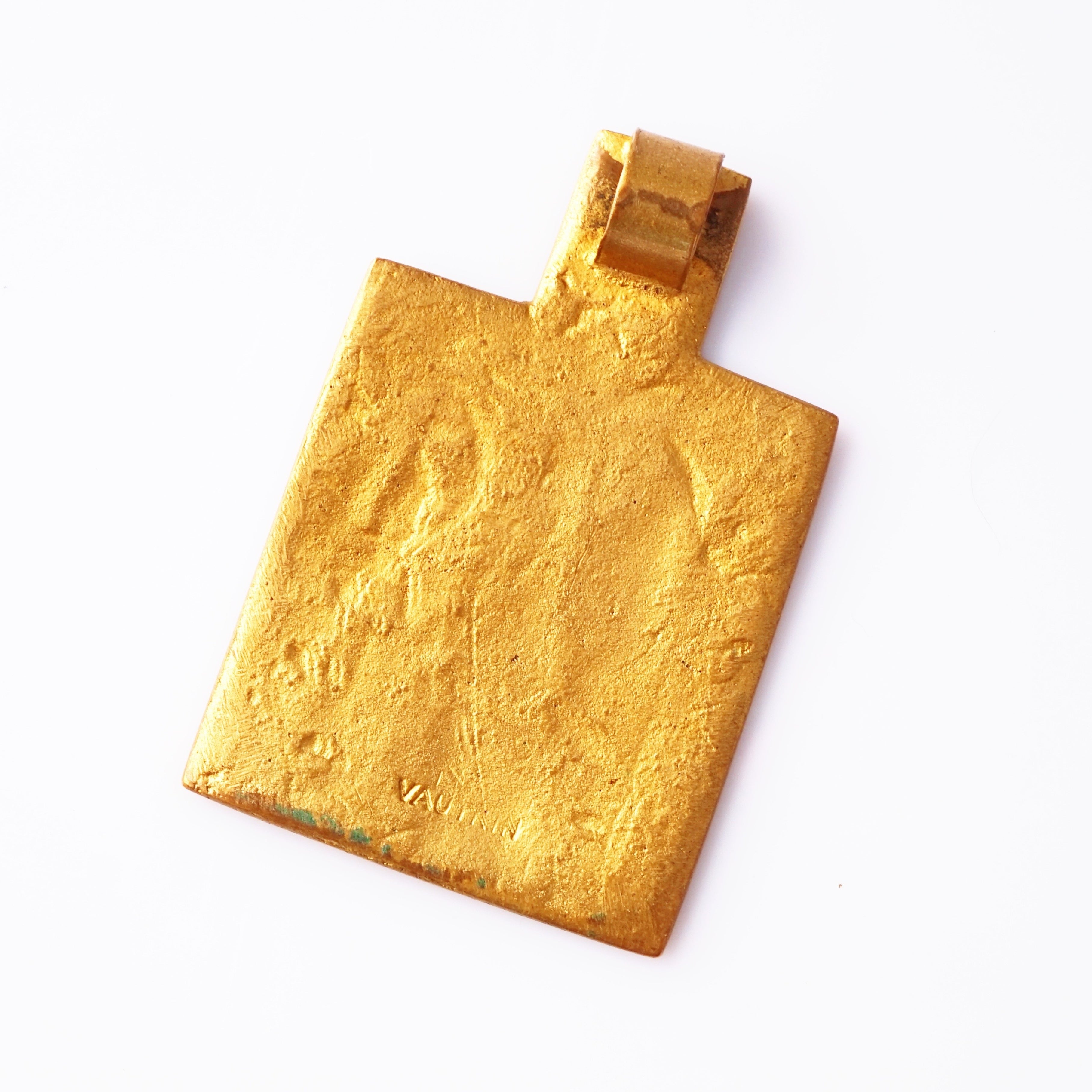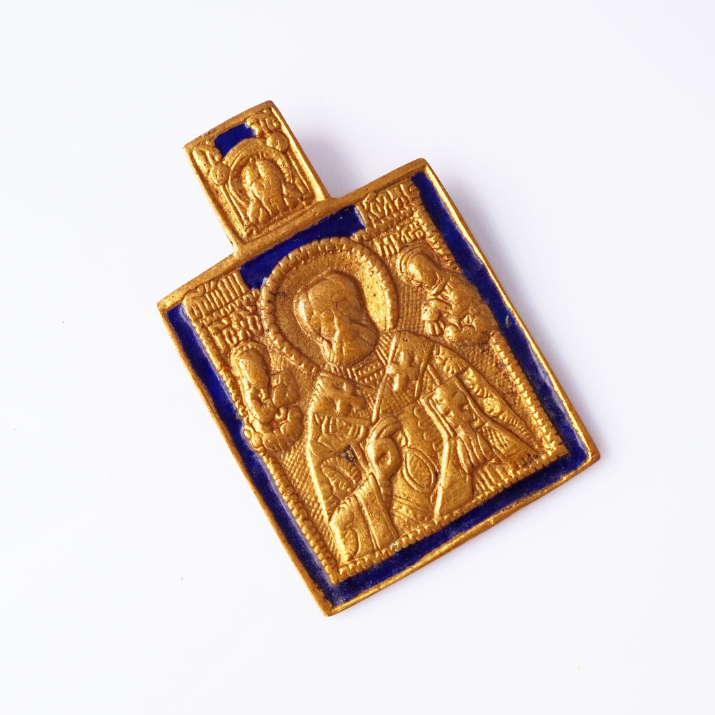 A striking example of French mid-century artistry, this 1960s Line Vautrin pendant depicts St. Nicholas rendered in finely detailed bronze relief, bordered with rich cobalt blue enamel. Vautrin’s signature blend of mysticism and modernism shines through in the sacred iconography, tactile texture, and subtle patina of age. Both spiritual and sculptural, it’s a captivating collector’s piece — part relic, part wearable art — embodying the poetic, timeless soul of Vautrin’s work.