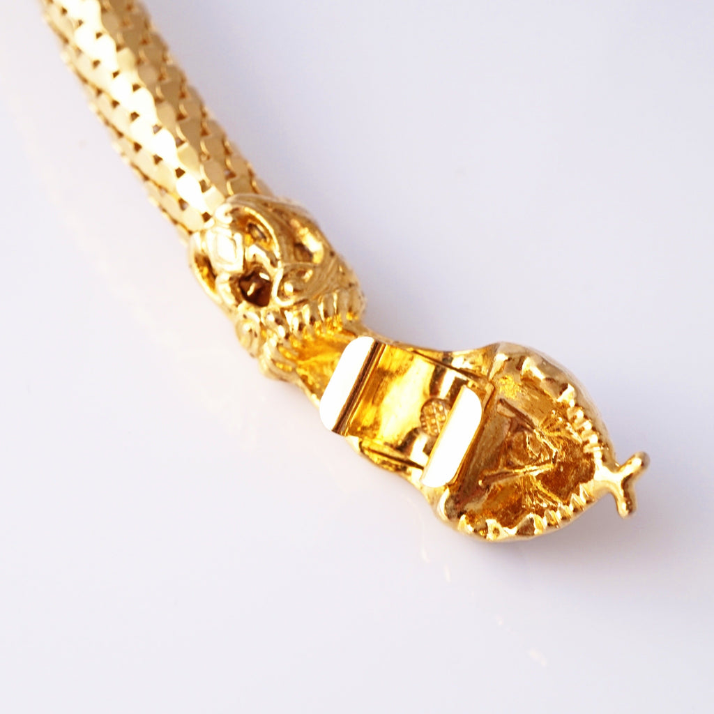 This vintage snake belt/necklace from the ’80s slithers effortlessly between statement jewelry and wearable sculpture. Crafted in gleaming gold-tone mesh, it wraps fluidly around the body or neck, catching the light with every movement. The detailed snake head features jewel-toned eyes and an adjustable clasp that slides along the flexible body, letting you style it as a belt, choker, or dramatic collar. It’s bold, sensual, and endlessly versatile — the kind of piece that makes you feel like Cleopatra strutted right into a Studio 54 afterparty.