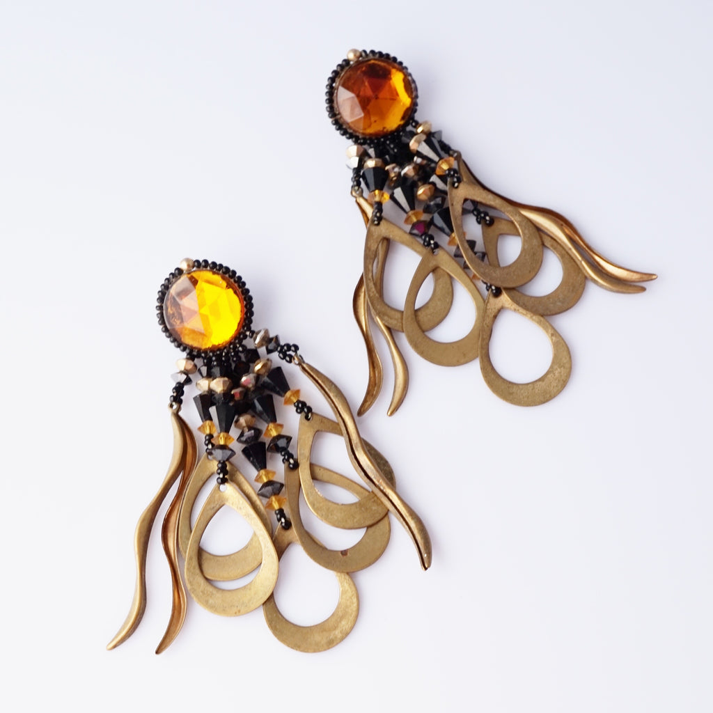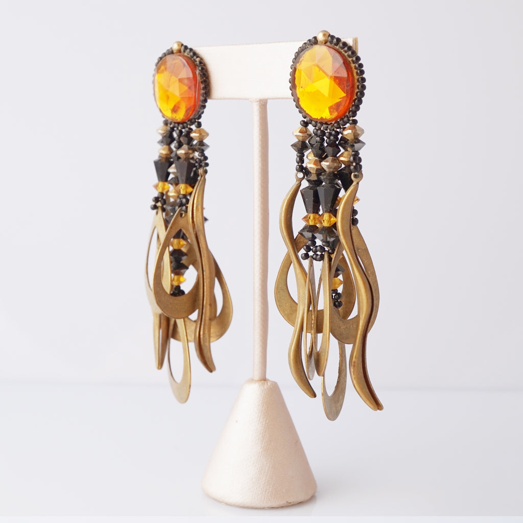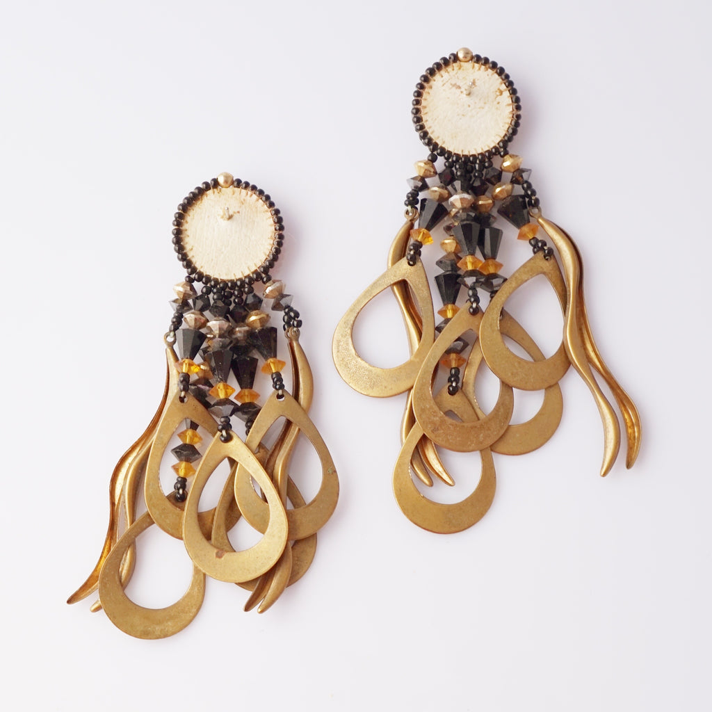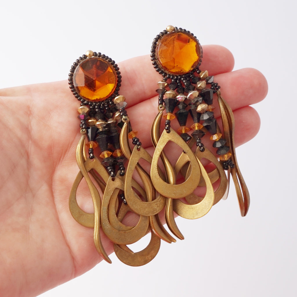 Black and Brass Beaded Dangle Earrings By Chipita, 1980s