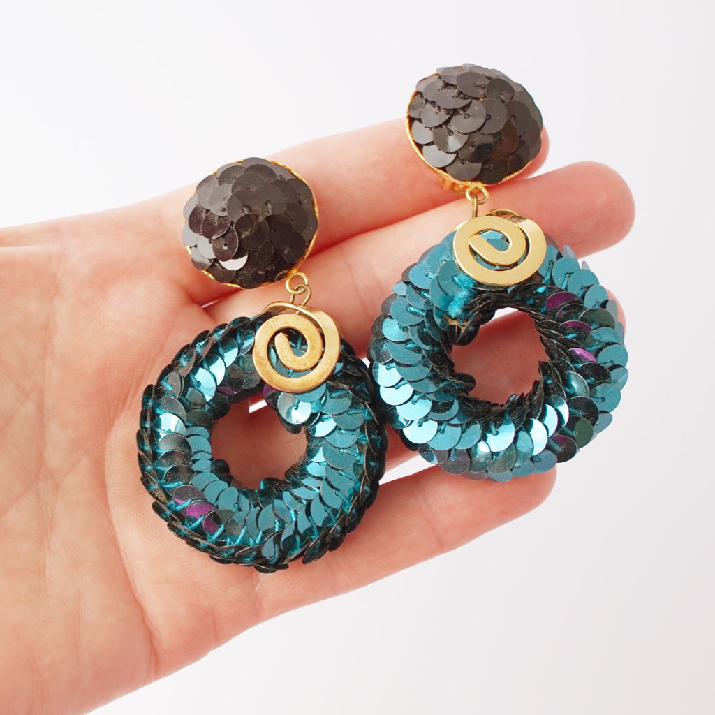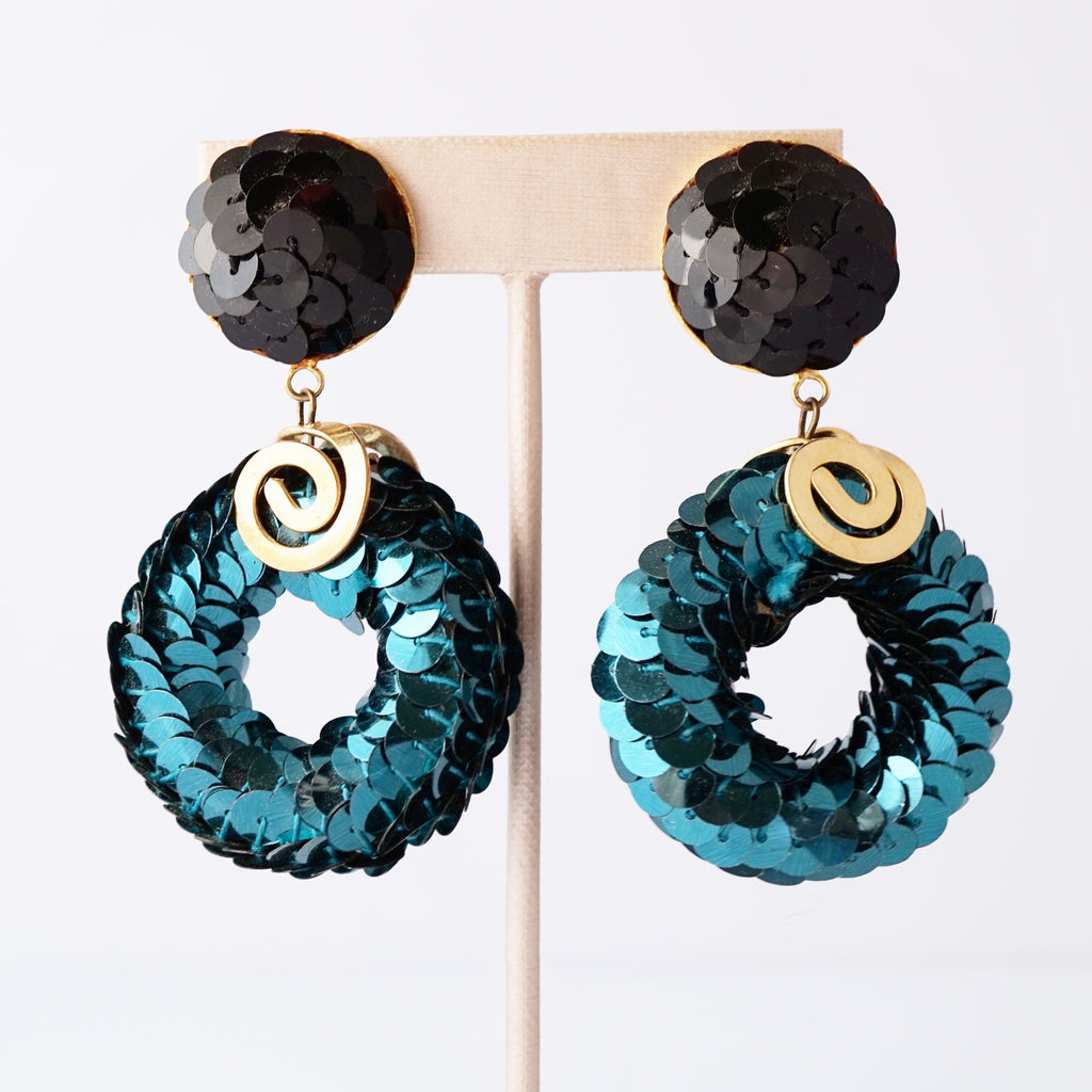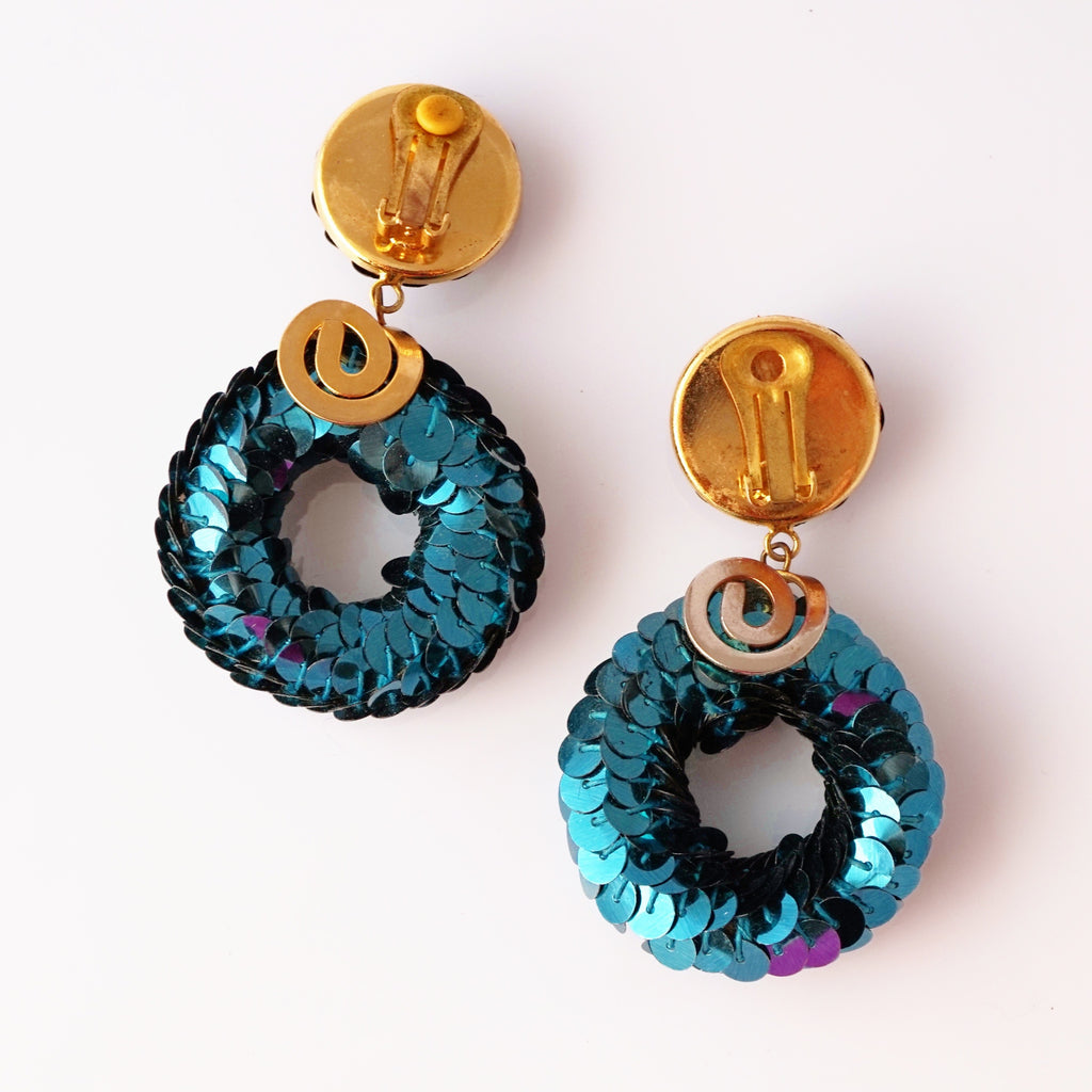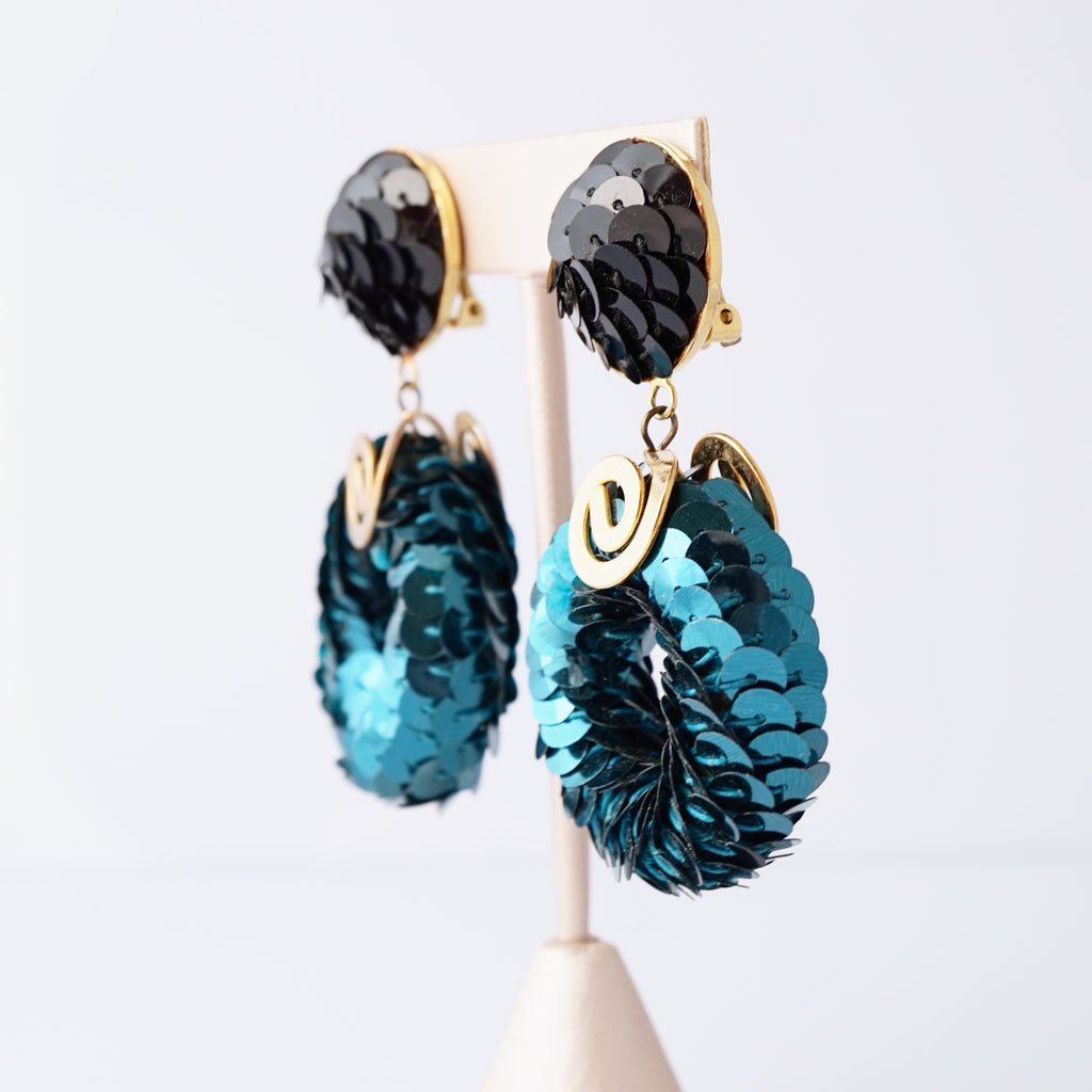Blue & Black Sequined Drop Statement Earrings, 1980s