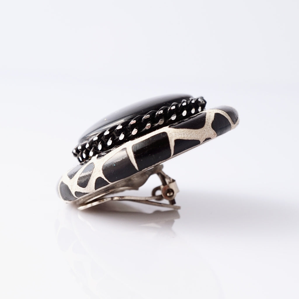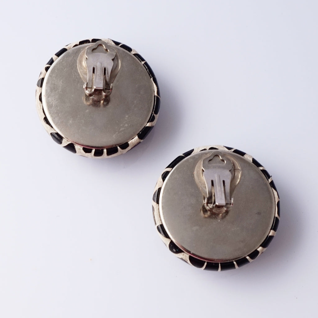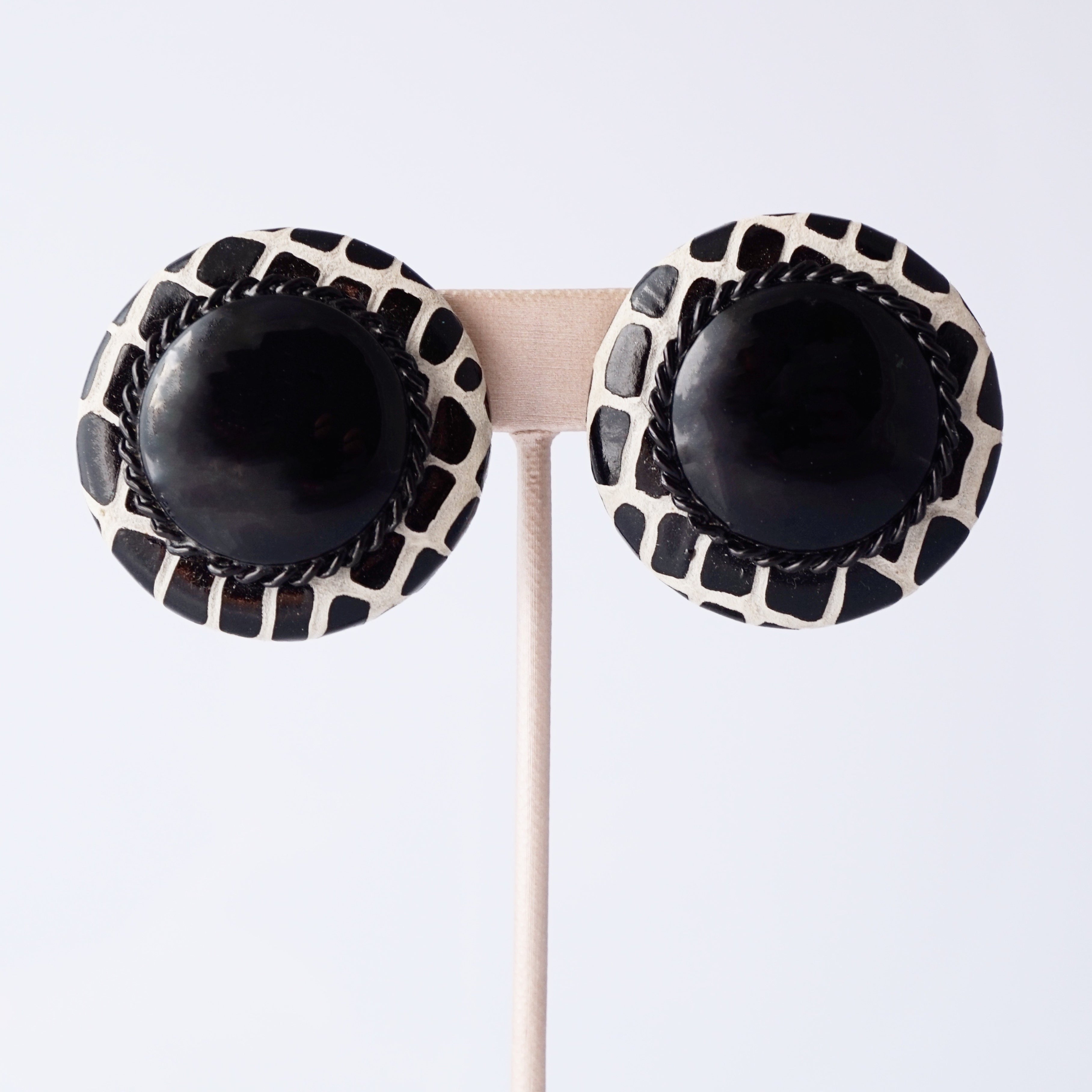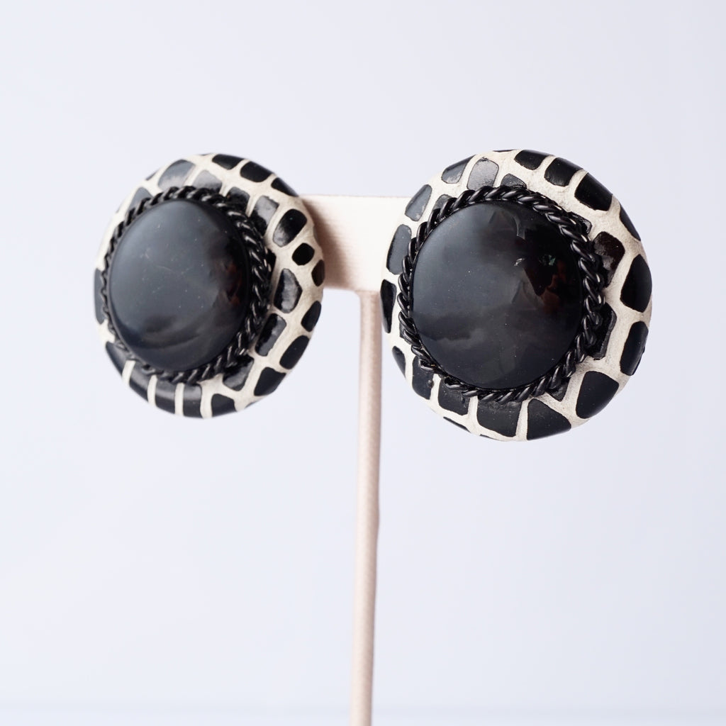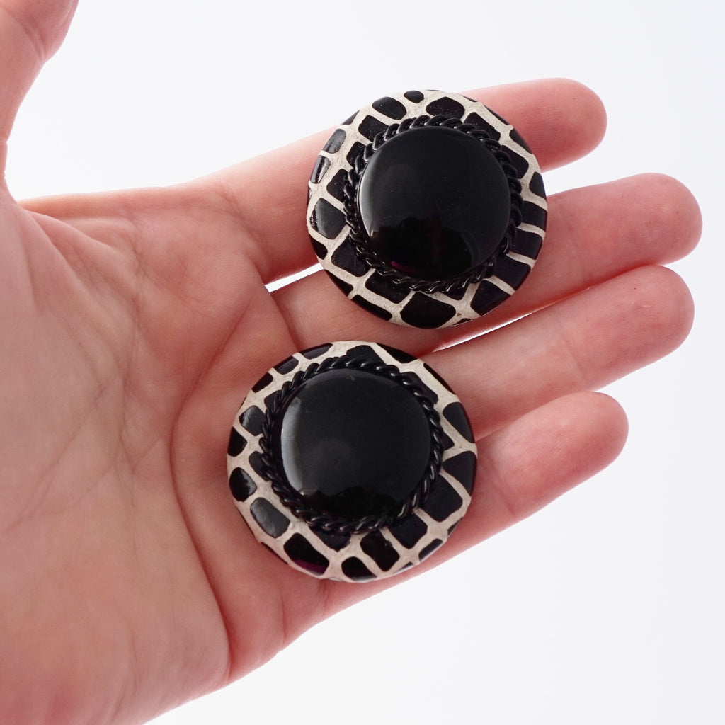 Faux Leather Black and White Giraffe Print Button Earrings, 1980s